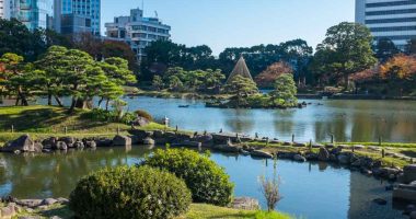 Beautiful Japanese-style gardens around a large pond built on the site of a mansion owned by a wealthy merchant during the Edo period.