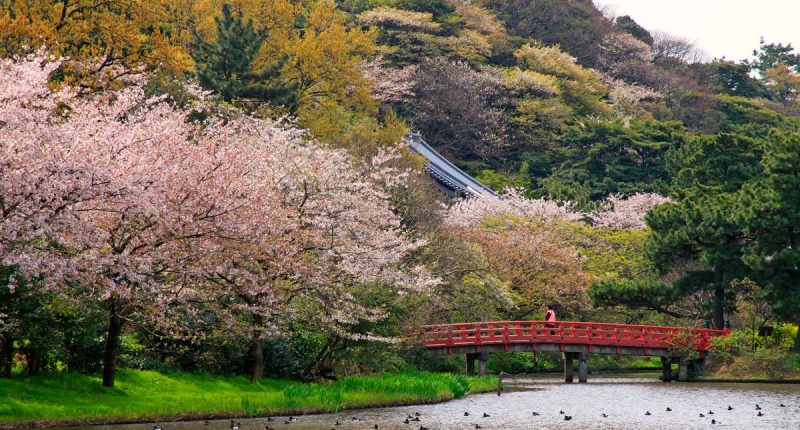 Evening light up of the cherry trees in Sankeien Garden. The garden which houses many historical buildings from across Japan is worth visiting any time of the year, but it is especially beautiful during the spring with the pagoda on the hill also lit. There is an entrance fee to visit the gardens, but the opening hours are extending during the light-up (until 9pm with last admission at 8:30pm).