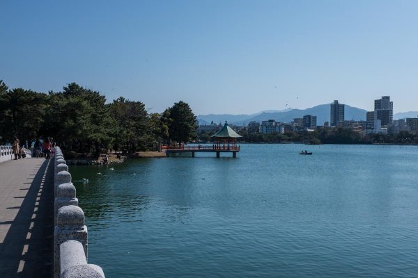 Ohori Park (大濠公園, Ōhori-kōen) is a park is the center of Fukuoka with a beautiful large pond. Ohori (大濠) means “large moat” in Japanese, and the park gets its name because the area once formed part of the moat network for the nearby Fukuoka Castle (only the remains of the castle stand today). In the 1920s the park was re-built based on proposals from a group of people including Honda Seiroku who also designed Hibiya Park in Tokyo, and opened to the public in 1929. The design saw three islands joined by four stone bridges constructed in the middle of the pond and a 2 kilometer path around the water which is popular with joggers. The red Ukimi Pavilion on the northern Willow Island was moved to the park in 1949. From March to early November visitors can rent small dinghies and swan-shaped paddle boats.