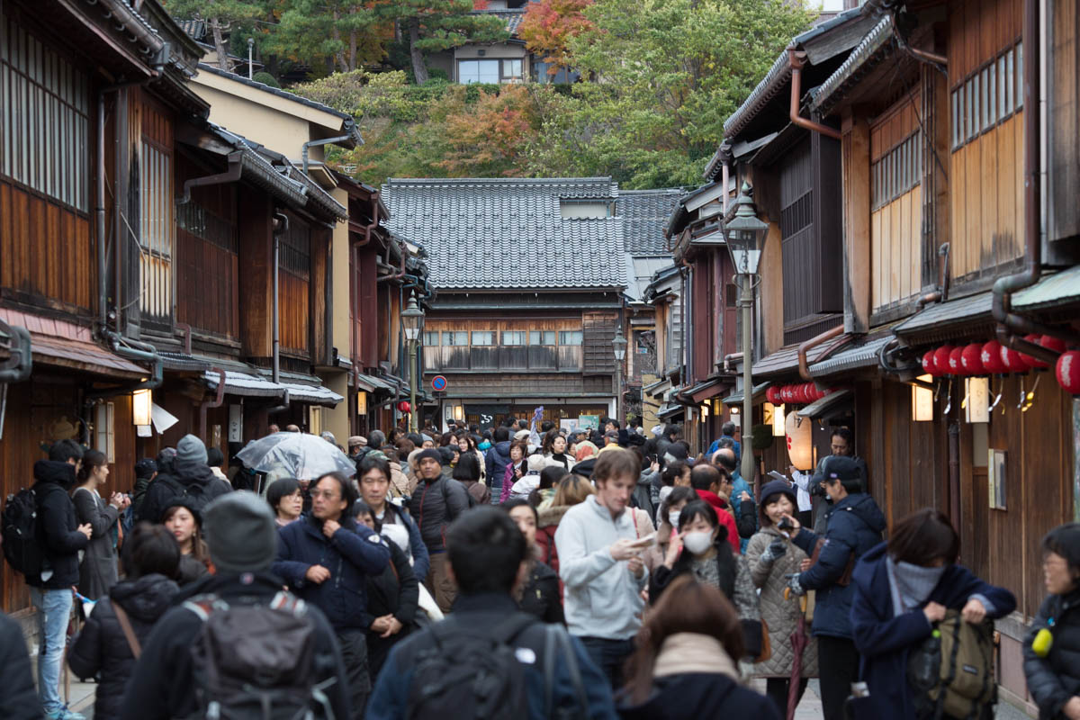 Although “chaya” (茶屋) literally means teahouse, they were actually establishments during the Edo period where guests would go to be entertained by geisha. They congregated in what are more often referred to as the “pleasure quarters” and Kanazawa has three of these chaya districts—Higashi Chayagai (ひがし茶屋街), Nishi Chayagai (にし茶屋街) and Kazuemachi (主計町)—but of these Higashi Chayagai is the largest and the most popular with visiting tourists. The photograph down the main street is another iconic shot of Kanazawa, and probably the image most used in travel guide books for the city.
