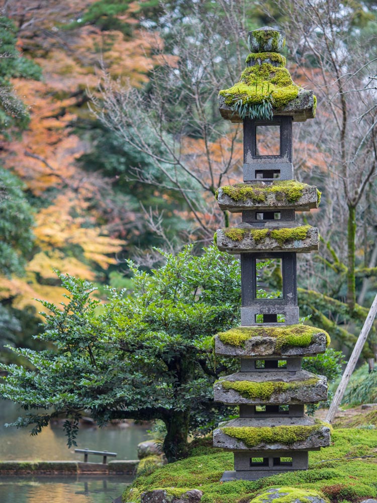 Notable features of the garden are the two-legged Kotoji Stone Lantern on the northern bank of Kasumigaike Pond, an icon of the park often featured in travel guides, and the fountain at the north end of the park powered by the natural water pressure from the higher level Kasumiga-ike Pond. This fountain is said to be the oldest in Japan.