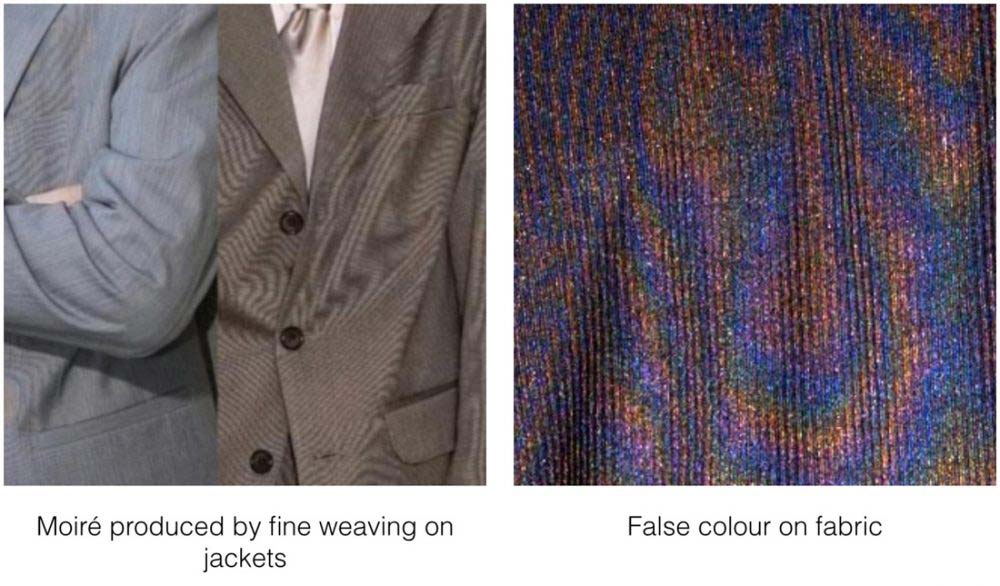 Moiré and false colour occur in digital photography where the level of detail in a pattern exceeds the resolution of the sensor (e.g. weaving in a fabric, fine mesh photographed from a distance). Moiré appears in the form of maze-like patterns not native to the original image and false colour in the form of colour transformations across the surface of the subject (again, not native to the original scene). The presence of false colour is exacerbated by the structured layout of the Bayer filter layout used in most digital camera sensors.