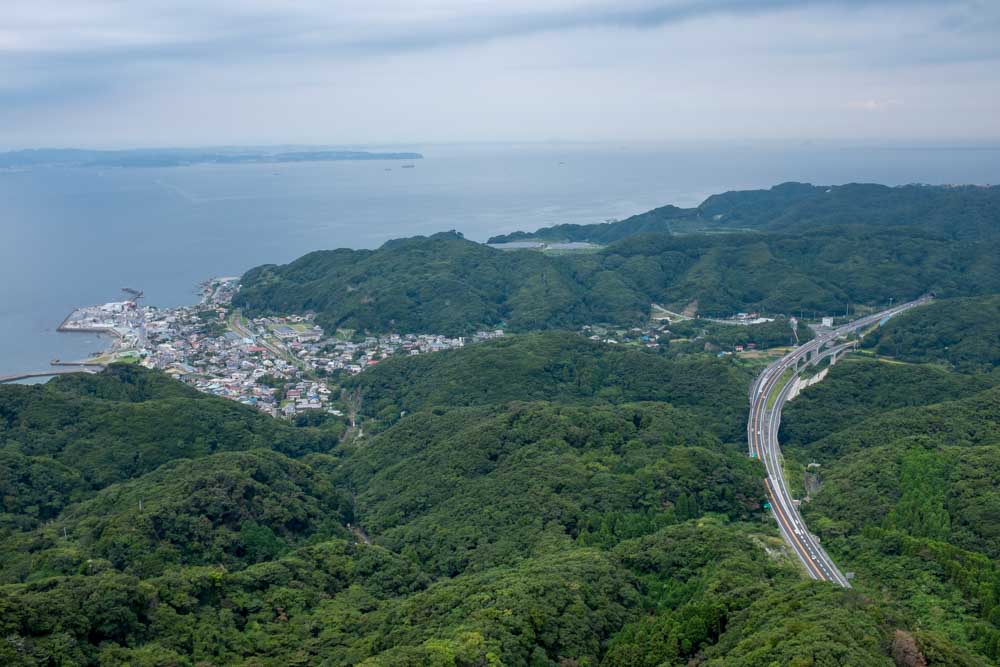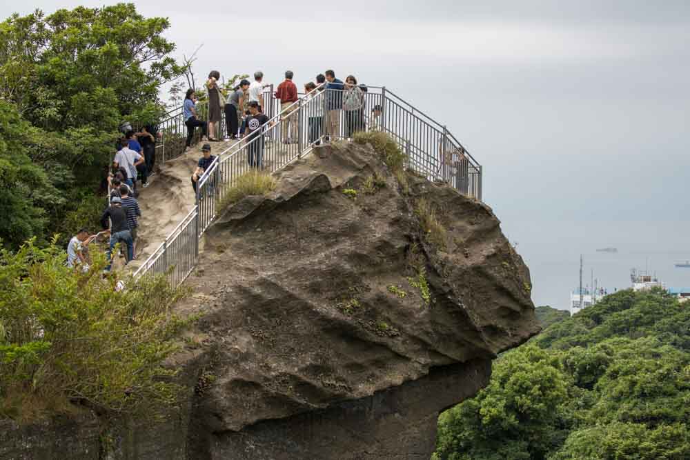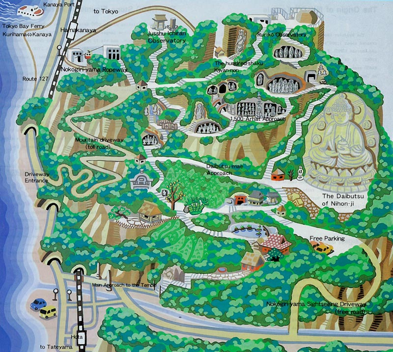 The other attraction is a viewing platform called jigoku nozoki (“Peek into Hell”) at the top of the mountain—a rock that juts out from the mountain face, hanging a hundred meters or so above the ground. Visitors queue to have their photograph taken at the edge (which is surrounded by iron fencing), but the views from anywhere on the top of the mountain are spectacular. To the west you have the ocean flowing into Tokyo Bay (on a very clear day you may also be able to catch a glimpse of a distant Mount Fuji), and elsewhere you have a panorama of the verdant green of the inland area of the Boso Peninsula with the Futtsu-Tateyama highway cutting through the landscape.