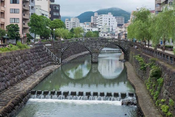 Meganebashi (眼鏡橋), sometimes known as “Spectacles Bridge”, gets this name from the distinctive double arches that, when reflected in the calm water of the Nakashima River, forms two circles that looks from a distance like a pair of glasses. The bridge was built in 1634 under the eye of a Chinese monk who would go on to become resident priest of Kofukuji Temple. Flooding damaged the bridge in 1982, washing away some of the stones, but it was restored to its original appearance thereafter. Today it is a designated Important Cultural Property.