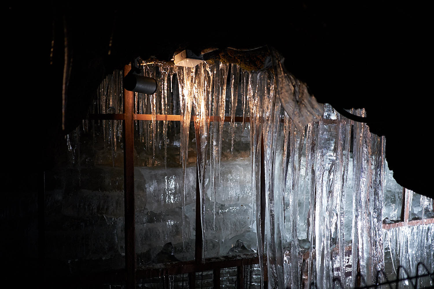The ice cave is 150-meters long and has an average temperature in the ice cave is 3°C. It is known for the icicles formed by the water that drips from the ceiling. Visitors are required to wear hard hats during their tour of the cave—a route that can be completed in under 10 minutes. This due to the low ceilings—as low as 1 meter in places—and slippery path. Caution is definitely advised as you move down towards the lower chamber. Please note that the Fugaku Wind Cave is also located a short walk away.