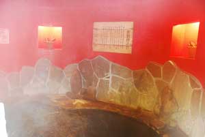The main tub outside has a Jacuzzi section and a small “Electric Cave” on the face of the stone wall at the far end of the bath—if you crouch and wade inside you will feel a pulsating frizzle on your skin! The other feature that separates Yumori no Sato from the rest is the sauna: it is heated by a traditional salt hearth called a shiogama which punctures the air with a crisp scent and certainly helps clear the airways.