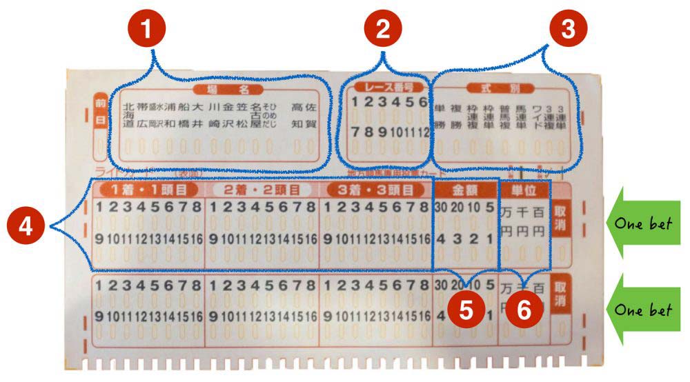 Incidentally, this site has the most detailed explanation (including helpful examples of the betting slips filled in for each type of bet), but it’s only in Japanese.