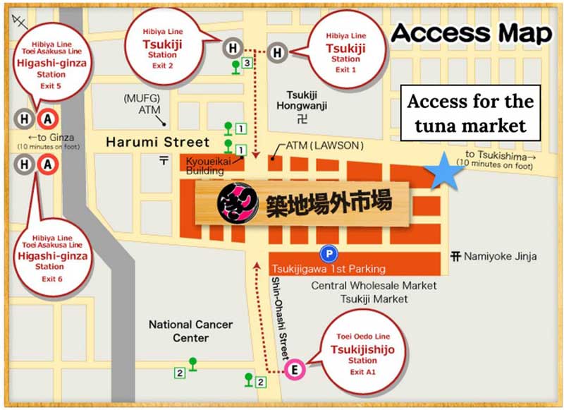 Come out of Exit A1 of Tsukijishijo Station and walk up the road with the shops to on the right-hand side. The outer market is on the right after about 100m. If you are arriving for the tuna auction note that the reception for registration is here near Kachidoki Bridge.