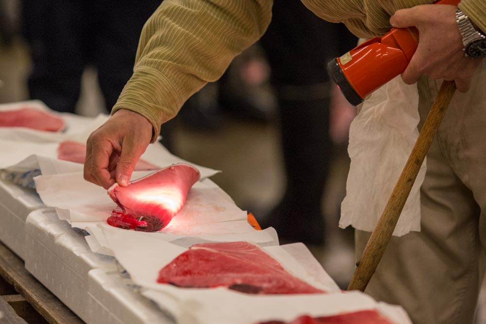 A buyer inspects the fish at the tuna auction.