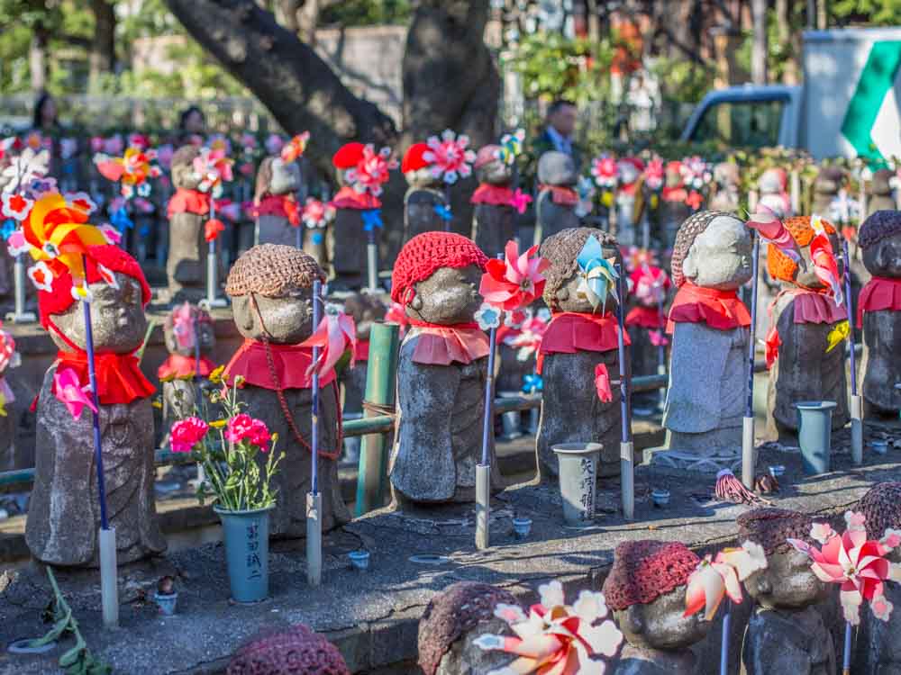 The temple grounds have many interesting features including a 21-meter high main gate (designated an Important Cultural Property), a 15-ton bell built in 1673 (daibonsho), the Mausoleum of Tokugawa Shoguns, as well as statues of Jizo, said to rescue children from limbo, that line the path to the north of the temple.